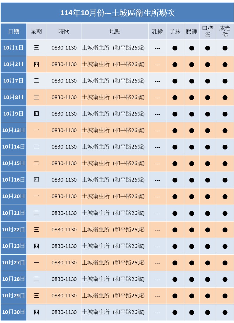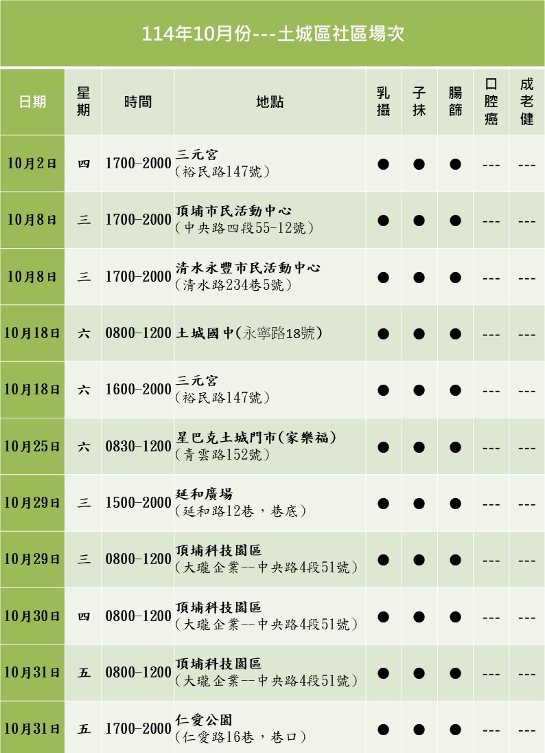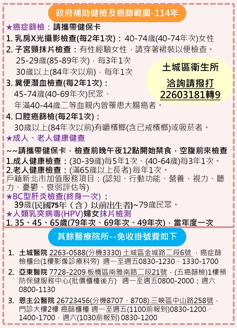 114年度10月土城區免費抽血健康檢查與癌症篩檢活動相關資訊
