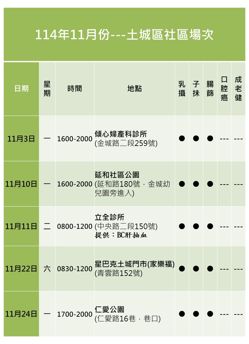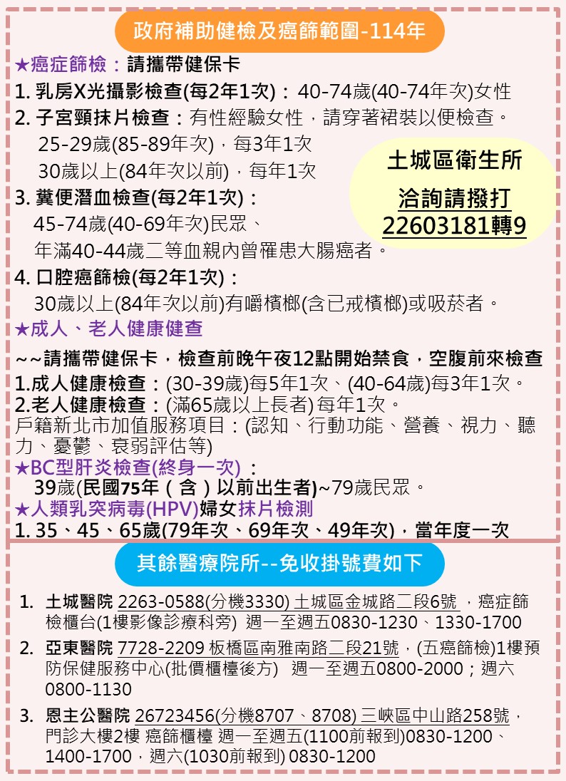 114年度11月土城區免費抽血健康檢查與癌症篩檢活動相關資訊