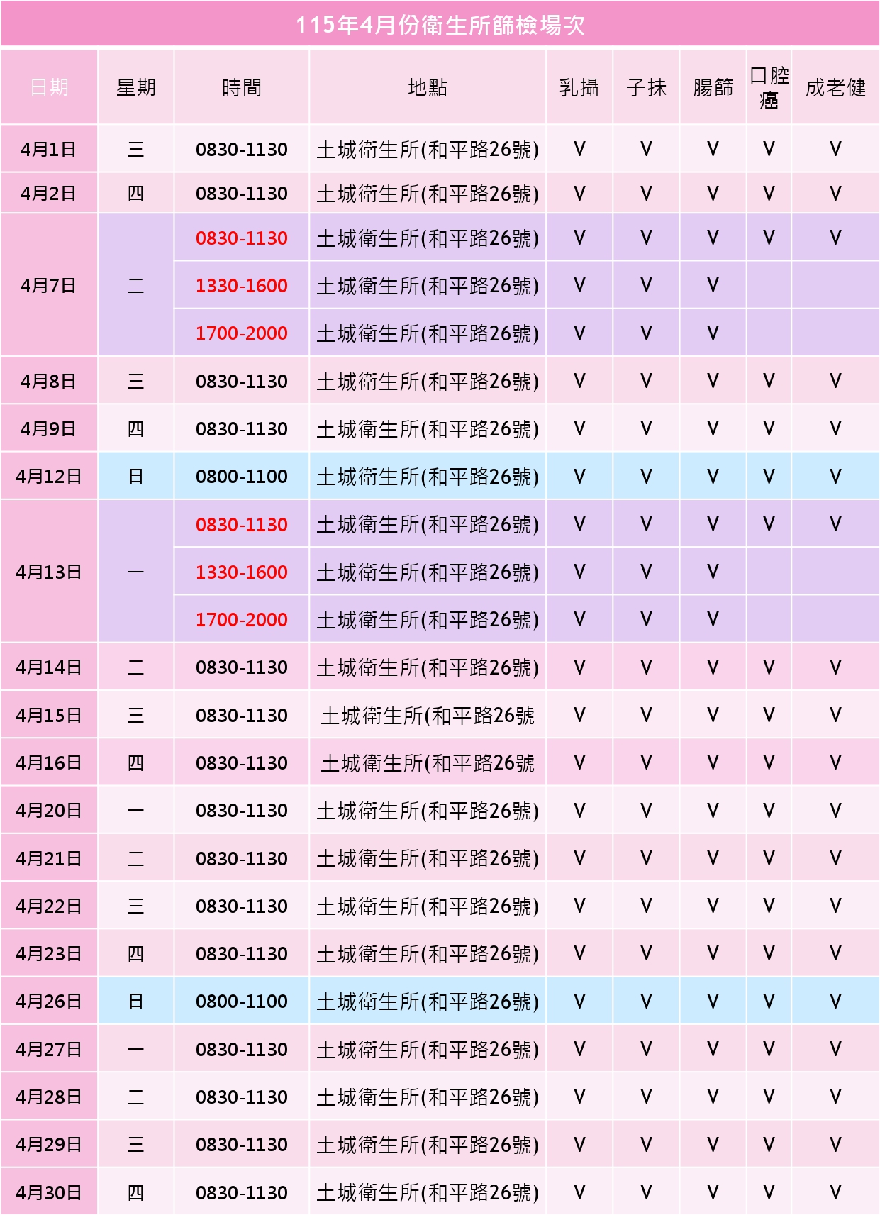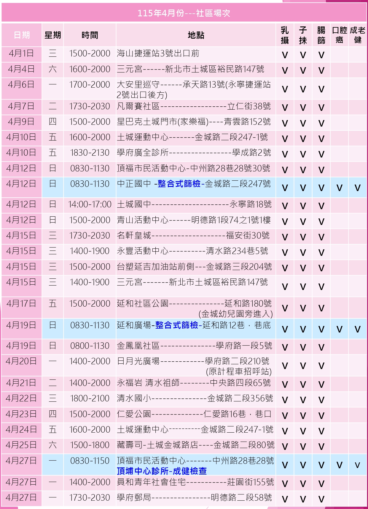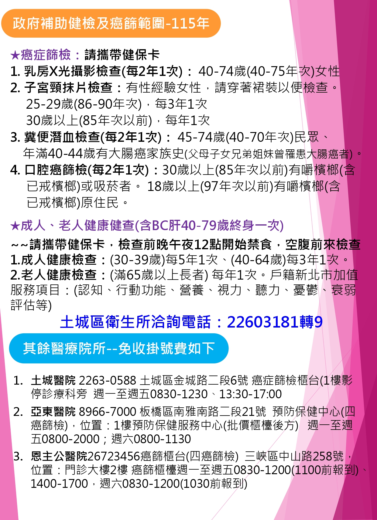 115年度04月土城區免費抽血健康檢查與癌症篩檢活動相關資訊