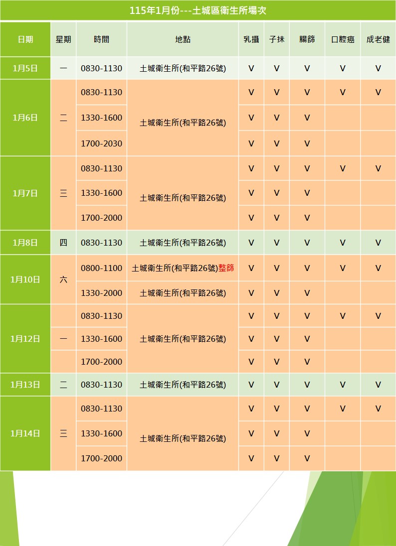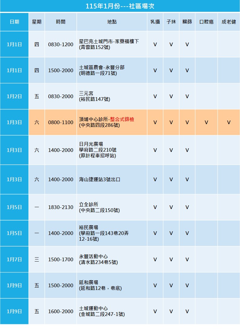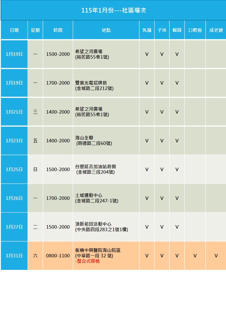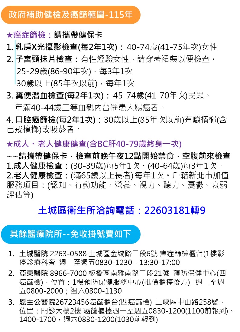 115年度1月土城區免費抽血健康檢查與癌症篩檢活動相關資訊